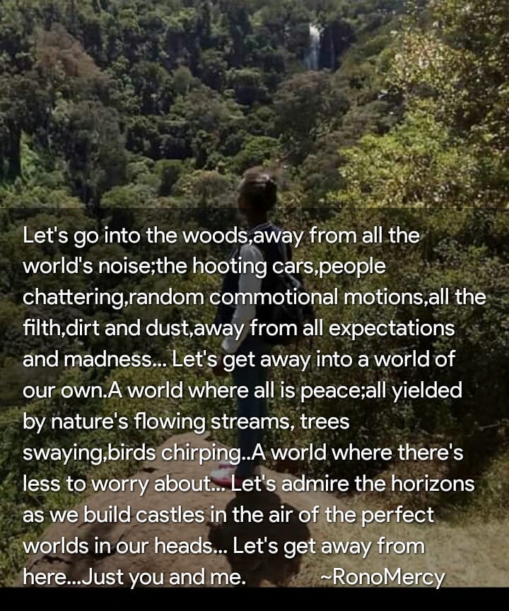 Let’s get away into a world of our own. A world where all is peace; all yielded by nature’s flowing streams, trees swaying and birds chirping. A world where there’s less to worry about.