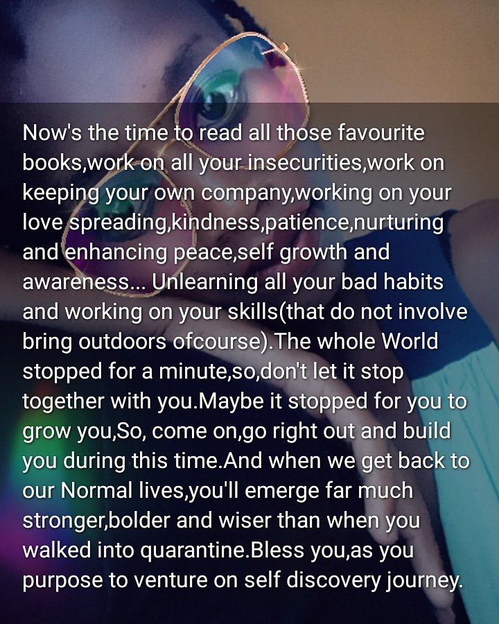 So,go right out and build you and grow you during this time.Abd when we get back to our normal lives,you’ll emerge far much stronger, bolder and wiser than when you walked into quarantine.Bless you as you purpose to venture on self discovery journey.